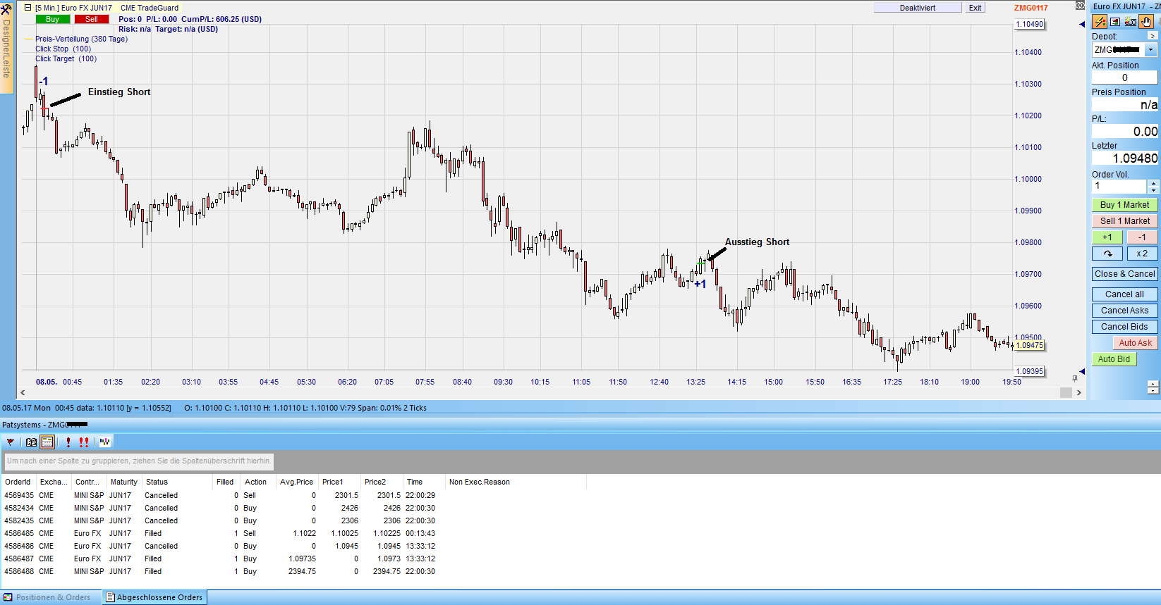 Die folgende Grafik zeigt im Chart die Ausführungen des Euro FX Trades und darunter die Ausführungen mit Uhrzeit in der Orderübersicht. Sie sehen: Hier wird nicht geredet, sondern real und mit echtem Geld gehandelt!