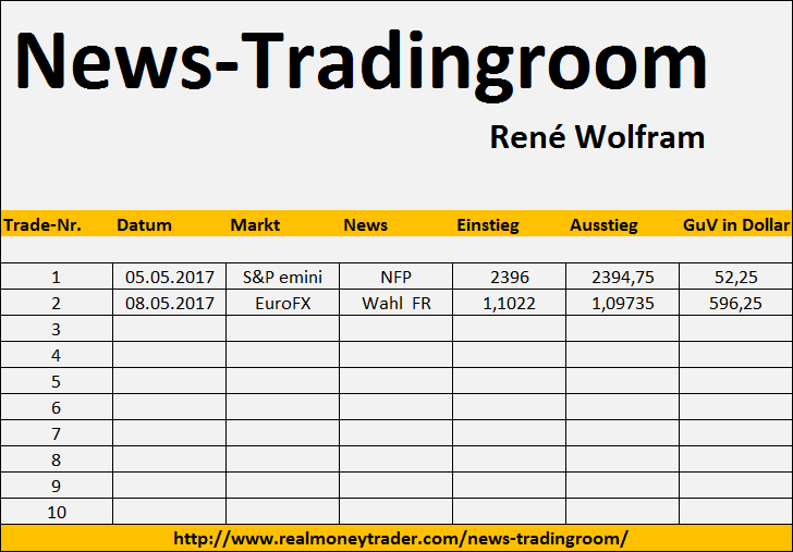 Am 01. Mai 2017 startete Profi-Trader René Wolfram den ersten reinen News-Tradingroom. Live per Webinar-Software übertragen handelt er die wichtigsten Nachrichten, die am Markt vermeldet werden und die Kurse in Wallung versetzen: Nonfarm Payrolls, FOMC-Meetings & EZB-Meetings (Notenbanksitzungen), Lagerbestandsdaten bei WTI Crude Oil und Natural Gas (Erdgas), Sondersituationen, wie beispielsweise die Frankreich-Wahl und auch die sogenannten Grain-News, die monatlich für heftige Ausschläge in Märkten wie Weizen, Sojabohnen oder Mais sorgen.