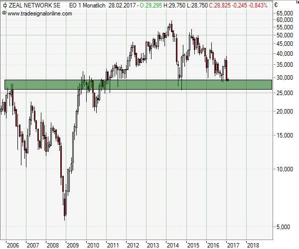 Werfen wir einen Blick auf den langfristigen Chart von Zeal Network, so lässt sich schnell die Unterstützungszone zwischen 25 und 28 Euro ausmachen. Nach dem bereits angesprochenen Abverkauf, konnte die Aktie auch genau in dieser Region ihre Talfahrt stoppen.