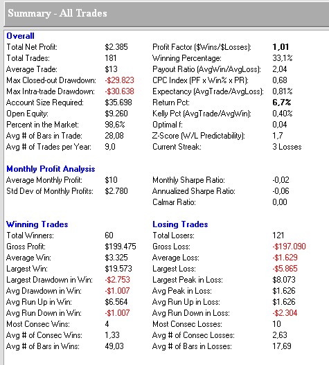 Eine Trefferquote von 33% ist nicht hoch, aber für eine Trendstrategie normal. Jedoch ist die Auszahlungsquote bei guten Trendstrategien drastisch höher. Dort ziehen einzelne Trades die Performance hoch, während die Mehrzahl moderat verliert. Hier ist nichts dergleichen zu erkennen. Die Strategie ist fast ununterbrochen im Markt, bindet also Kapital. Und sie bringt gar nichts, was der profit-Factor von 1.01 klar zum Ausdruck bringt!
