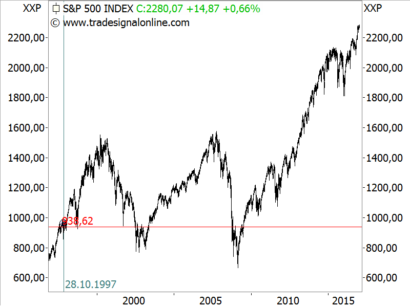 Wenn 27,9 der mit Abstand höchste jemals erreichte Wert im Shiller KGV wäre UND wenn dieser zudem relativ präzise am Hoch des Aktienmarktes aufgetreten wäre, DANN und nur dann könnten Sie aktuell eventuell einen Nutzen daraus ziehen. Doch dem ist eben nicht so. Es gab Crashs, vor denen das der Höchstwert des Shiller KGV war. Doch in der Historie gab es auch drastisch höhere Indikationen. Wie die nachfolgende Grafik veranschaulicht erreichte das Shiller KGV den vermeintlich kritischen Wert von 28 bereits Ende 1997. Damals stand der S&P 500 bei etwa 940 Punkten.