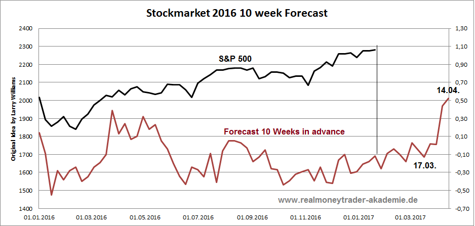 Das bedeutet nicht, dass wir im Markt nicht jederzeit einen Crash bekommen könnten. Doch die Indikation ist viel zu schwach und zu wenig signifikant, als dass darauf basierend auch nur ansatzweise eine Wette (Position) eröffnet werden könnte. Bitte verstehen Sie mich nicht falsch. Ich bin nicht pauschal bullish und auch nicht pauschal bearish. Mir ist es völlig egal, ob es steigt oder fällt, da ich beides handeln kann. Wir haben haufenweise Kennziffern, die in Extremzonen notieren, doch genau solche bis dahin historischen Extremwerte (z.B. Cashquote, Margin Debt etc.) wurden in der Vergangenheit immer wieder nach oben durchstoßen. Ein Blick auf den 10-Wochen-Forecast für den US-Aktienmarkt zeigt sogar das genaue Gegenteil: eine scharfe Rallye bis in den April hinein, speziell mit einer dynamischen Phase ab Mitte März.