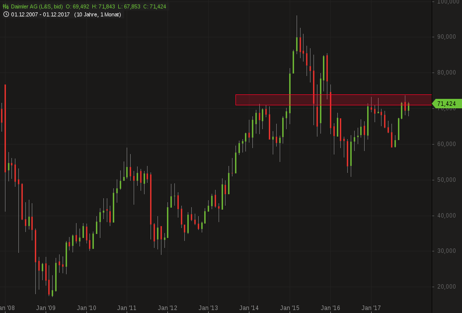 Die Aktie von Daimler knabbert aktuell wieder am Widerstandsbereich, welcher zwischen 71 und 74 Euro besteht. Solange die Aktie diesen nach oben nicht durchbricht, bleiben wir weiterhin in dem entsprechenden Discount Put Optionsschein investiert.