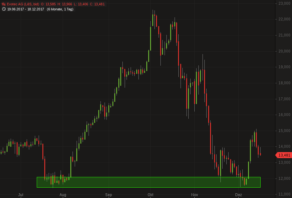 Die Aktie von Evotec hatte sich seit Anfang Oktober diesen Jahres bis zum Kaufzeitpunkt nahezu halbiert. In der wichtigen Unterstützungszone, welche zwischen 11,50 Euro und 12,50 Euro verläuft konnte der Wert seinen Abwärtstrend zunächst stoppen. Die durch gestiegene Volatilität (Schwankungsbreite) in dieser Aktie, hat sich der Einstieg in ein entsprechendes Discount-Zertifikat angeboten.