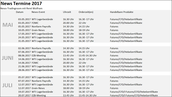 Es ist endlich soweit – der erste reine News-Tradingroom im deutschsprachigen Raum wird ab 01. Mai seine Pforten öffnen. Per Webinarsoftware überträgt Profi-Trader René Wolfram an allen von ihm gehandelten News-Events seine Trades live in Bild und Ton. Gehandelt werden unter anderem der S&P emini (bei Nonfarm Payrolls und FOMC Meetings), der EuroFX (bei EZB-Meetings), WTI Crude Oil und Natural Gas (bei den jeweiligen Lagerbestandsdaten) und mitunter auch Agrarrohstoffe, wenn der monatliche Report veröffentlicht wird. Wer noch teilnehmen möchte, der kann sich jetzt noch das Early Bird Special sichern…