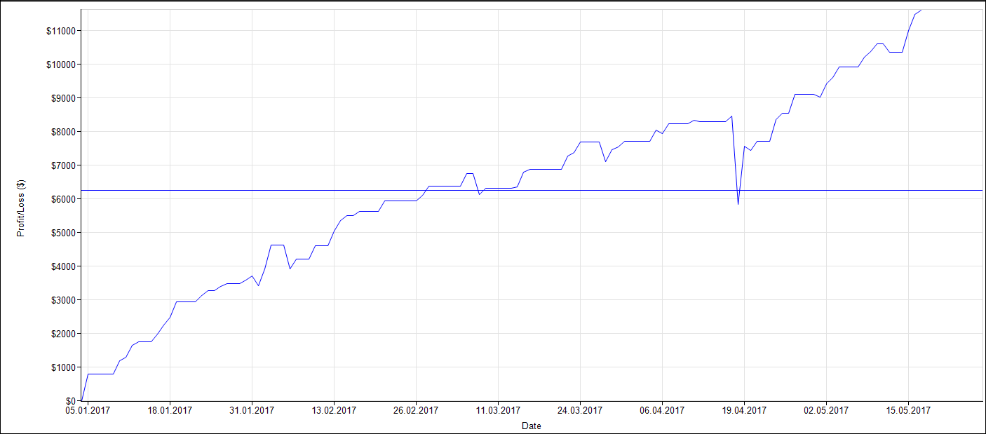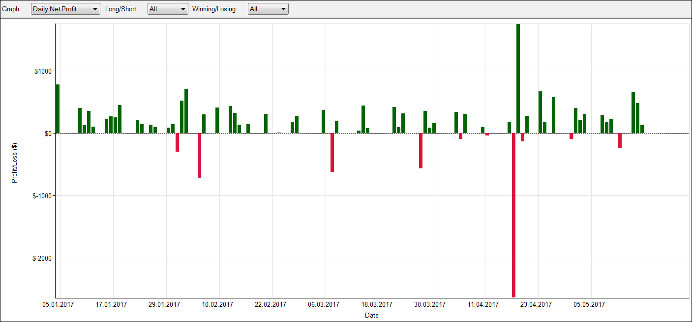Eine andere Darstellung (GuV) illustriert dies nochmals eindrucksvoll. Sie sehen die Darstellung des täglichen Netto-Profits für mein Worldcup-Konto 2017. Man sieht bereits auf den ersten Blick, dass die großen Gewinner und die großen Verlierer unmittelbar benachbart auftraten. Ob das nun größere Einzelverluste sind, auf die längere Gewinnstrecken sind oder ob wir von einzelnen Gewinner-Trades sprechen ist dabei völlig gleich. Ich verdiene am langen Ende (das meint 2-3 Jahre) immer wieder Geld, weil ich bereit bin, Risiken einzugehen und Schwankungen gegen mich zu erdulden. Weil ich das Prinzip verstanden und akzeptiert habe, dass für einen großen Ertrag auch eine Investition in einer gewissen Höhe notwendig ist, handele ich bei größeren Rückschlägen weiter. Die meisten Retailtrader stoppen den Handel oder modifizieren ihn, sobald es stärker gegen sie ausschlägt. Von den unmittelbar benachbart auftretenden Gewinnen können sie dann nicht mehr profitieren.