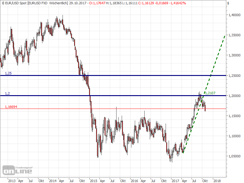 Nach der gestrigen EZB Sitzung war klar, dass das Anleihenkaufprogramm zwar zurückgefahren wird, eine Zinsanhebung aber aktuell wieder in weite Ferne gerückt ist. Dagegen signalisierte die US-Notenbank zuletzt, dass man weitere Zinsschritte vornehmen wird. Daraufhin kam das Währungspaar EUR/USD deutlich unter Druck. Charttechnisch wurde damit die wichtige Unterstützung bei 1,16694 USD unterschritten. Außerm ist der im Chart dargestellte Aufwärtstrend gebrochen. Mit einem Discount Put Optionsschein lässt sich bis zum 15.06.2018 eine Seitwärtsrendite von 36,29% p.a. erzielen, sofern der Wechselkurs am Ende der Laufzeit unterhalb von 1,20 USD notiert.