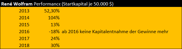 Seit 2016 werden keine Gewinne mehr entnommen und mit dem Jahresendstand des Kontos aus dem jeweils vorherigen Jahr weiter gehandelt. Bis dahin belief sich das Startkapital der vorherigen Jahre stets auf 50.000 Dollar.