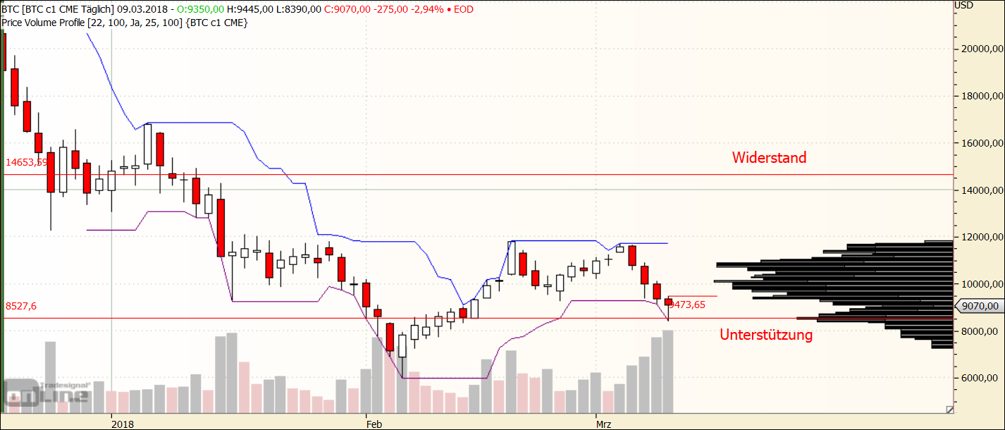 Jüngst hatten wir darüber gesprochen, dass der Bitcoinpreis in seiner noch jungen Historie am Futuresmarkt einen Volumen-Support im Bereich um 8.000 Dollar ausgebildet hat. Wie gesagt: Die Historie echter, bezahlter Futureskurse ist natürlich sehr jung und das Volumen im Bitcoin nimmt mit der Zeit zu, so dass es sehr mit Vorsicht zu genießen ist, wenn wir aus dem Volumen Supports und Widerstände herleiten wollen. Behalten Sie dies bitte für die kommenden Monate im Hinterkopf.