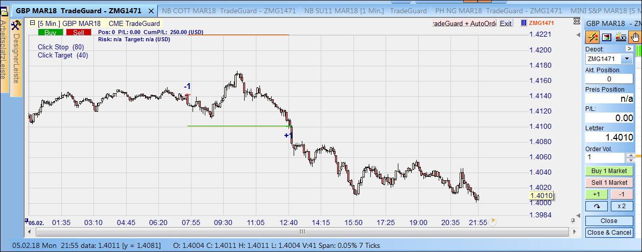 Der erste Trade wurde im Britischen Pfund um 7.45 Uhr eingegangen. Kurz vor dem zeitbasierten Ausstieg um 13 Uhr erreichte der Markt das Gewinnziel und ging mit 250 Dollar Gewinn raus.