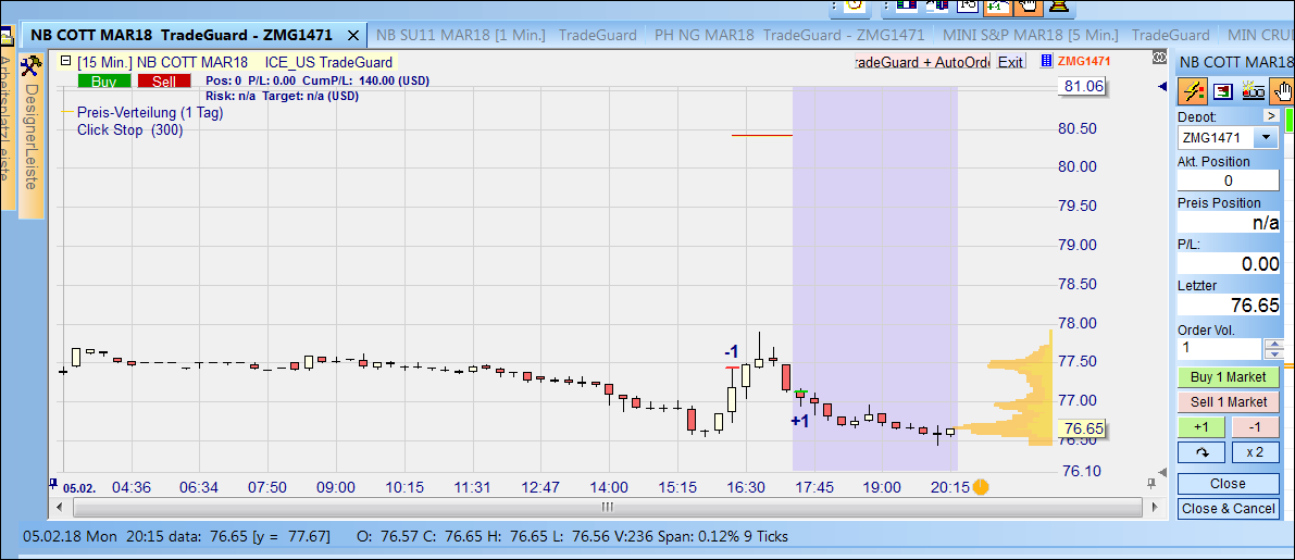 Um 14 Uhr arbeitet jeweils die Cotton-Strategie. Es wurde ein Limit in den Markt gelegt bei 77,42, welches relativ spät innerhalb des bis 17.30 Uhr reichenden Handelszeitfensters erreicht wurde. Als der zeitbasierte Exit um 17.30 Uhr griff standen immerhin 140 Dollar Profit zu Buche.