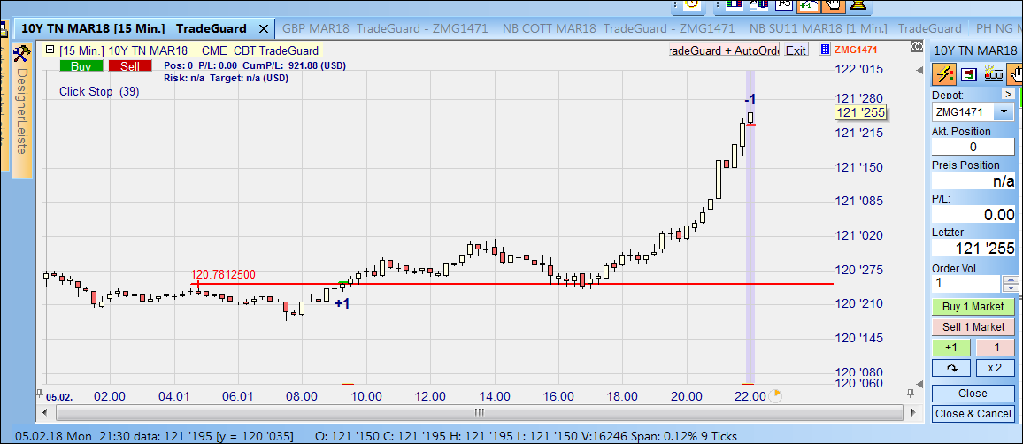 Die zweite Order wurde um 9 Uhr in den Markt gegeben. Gehandelt wurden die 10yr T-Notes auf der Longseite auf Basis von Renés „MondayBonds-Setup“. Die Strategie zielt auf einen ganztägigen Trend ab und stellt erst zum Handelsende der US-Kassabörsen die Position glatt (22 Uhr unserer Zeit). So war der zweite eröffnete Trade der letzte, der geschlossen wurde, bei dem aber auch der mit Abstand größte Profit verbucht werden konnte. Bei Abschluss des Trades stand ein Profit von 921,88 Dollar auf dem Tacho.