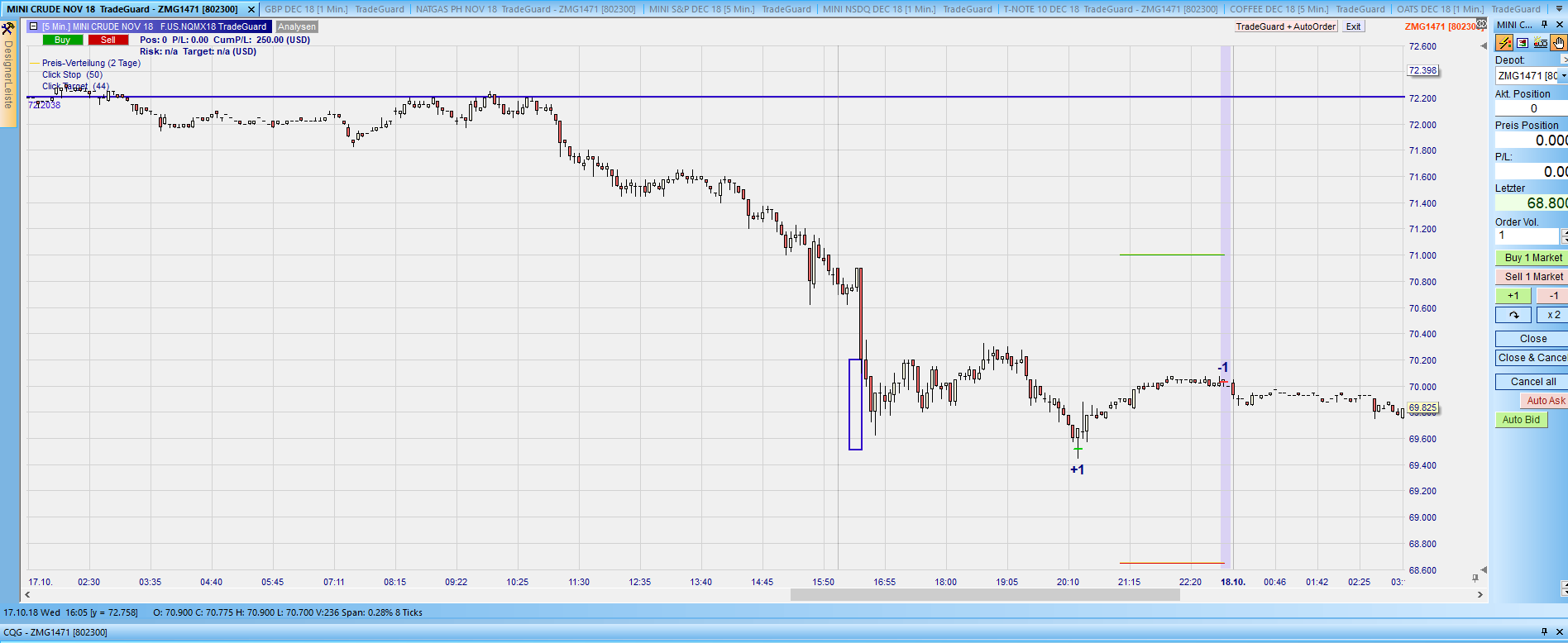 Die Strategie “Range-Projektion” war die Grundlage für einen News-Trade vom Mittwoch im Rohöl. Mit der besagten Handelstechnik gelingt es überdurchschnittlich oft, die zwischenzeitlichen Reaktionspunkte (Tiefs oder Hochs) recht präzise zu treffen und einen schnellen Gewinn zu erzielen. Kleines Makel: Das Gewinnpotenzial dieser Trades ist nicht unbegrenzt, so dass meist Gewinne von 150-400 Dollar, jedoch selten mehr, anfallen.