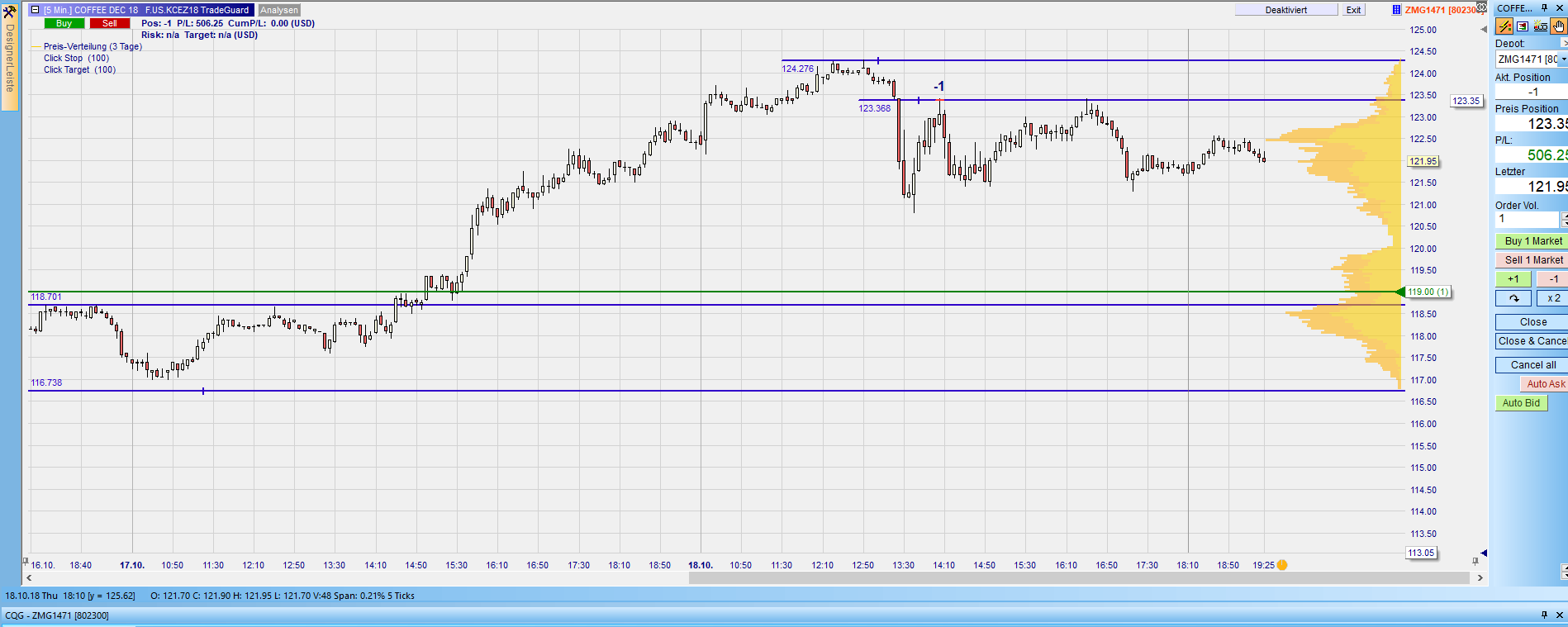 Die in unserer Trader-Ausbildung geschulte Strategie „Huge Range Open“ stellt die Grundlage für den folgenden Trade aus dieser Woche dar, einen Short auf Coffee, der am Donnerstag eröffnet wurde. Die Position läuft zum gegenwärtigen Zeitpunkt noch und hat ein Ziel bei 119 US-Cent, was einem Profit von mehr als 1.600 US-Dollar entspricht. Derzeit sind davon aber erst 506 Dollar Buchgewinn zu verzeichnen. Freitage sind im Kaffee-Future im langfristigen Durchschnitt außergewöhnlich schwach. Auch dies wurde bei der Trade-Eröffnung berücksichtigt.