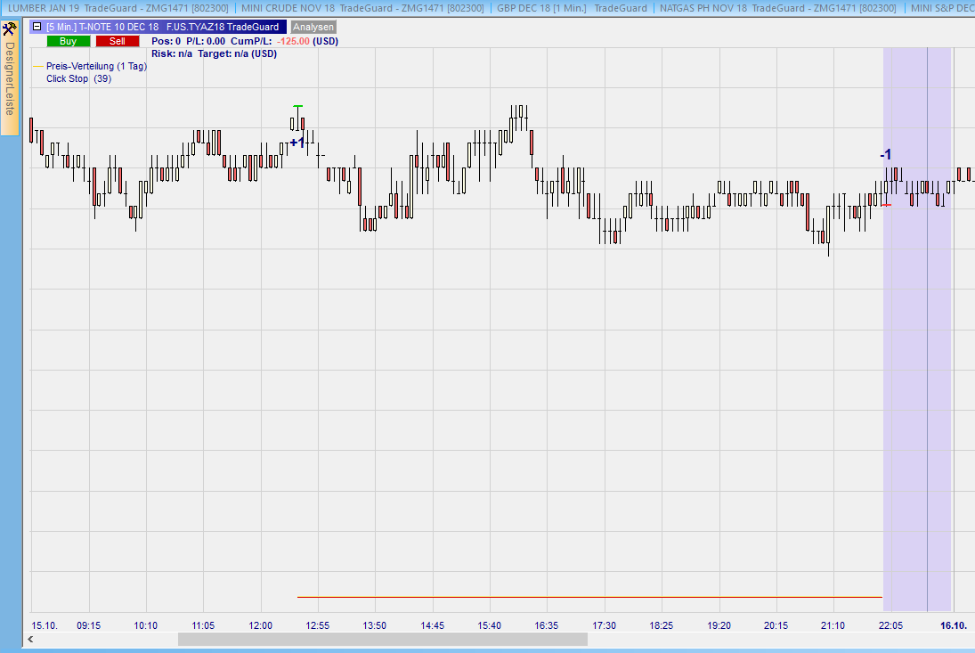 Und um auch zu zeigen, dass es völlig selbstverständlich zum Alltag eines hauptberuflichen Traders gehört, auch Verluste zu machen, hier ein Trade basierend auf der Strategie „Monday Bonds“, der einen Verlust von 125 Dollar (135 Dollar inkl Gebühren) am Montag produzierte.