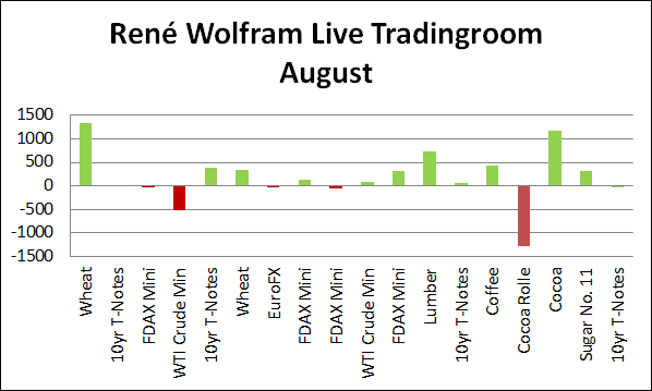 In den meisten Jahren erweisen sich Herbst und Winter als performance-trächtige Zeiten. Das liegt daran, dass im Herbst die Volatilität naturgemäß in sämtlichen Märkten anzieht, speziell in den Hauptmärkten, wie S&P 500, DAX, Gold, aber auch Rohöl. Märkte, wie Kaffee und Zucker starten zwischen  August und Oktober oftmals starke Trendbewegungen, von denen wir profitieren wollen. Wir gehen mit 3402 Dollar Gewinn nach Gebühren in die letzte August-Handelswoche.