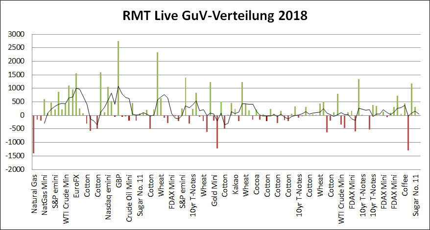 Es gelingt bislang sehr gut, die Schwankung in der Equity gering zu halten. Die meisten Verlust-Trades liegen zwischen 150 und 500 Dollar, nur drei Trades verloren mehr als 1000 Dollar. Kapitalschutz ist immer der viel wichtigere und vor allem vorgelagerte Schritt, ehe es um die Performanceseite geht. Denn wer sein Kapital zu erhalten vermag, der wird früher oder später gar nicht umhin kommen, Geld zu verdienen.