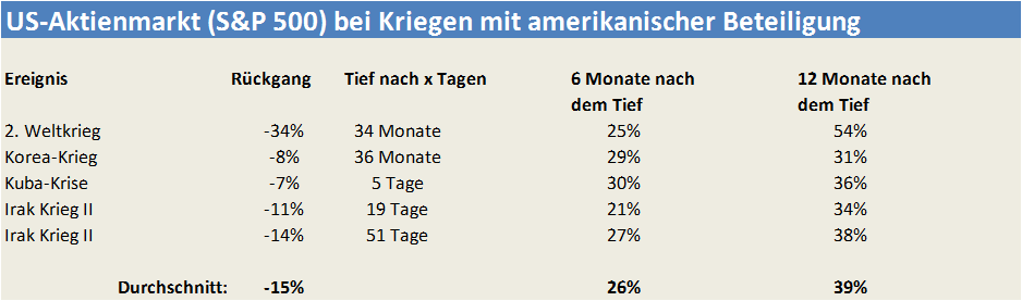 Wann immer außergewöhnliche Ereignisse auftreten oder am Horizont erscheinen ist das Beste, was man meiner Erfahrung nach tun kann, nicht panisch und aktionistisch zu werden, sondern das Thema auf eine sachliche und fachlich fundierte Ebene zu transportieren. Man sollte also in die Statistik schauen und prüfen, was in der Vergangenheit bei ähnlichen Ereignissen passierte. In meine bald 20-jährige Börsenzeit fielen mit dem Platzen der Dotcom-Blase, 9/11, dem Afghanistan-Krieg, dem Irak-Krieg und der Lehmanpleite einige außergewöhnlich markante Einschnitte für die Börse. Die nachfolgende Tabelle zeigt, was in der Vergangenheit im Kontext mit einem Krieg, an dem die USA beteiligt sind, mit dem Aktienmarkt passierte.