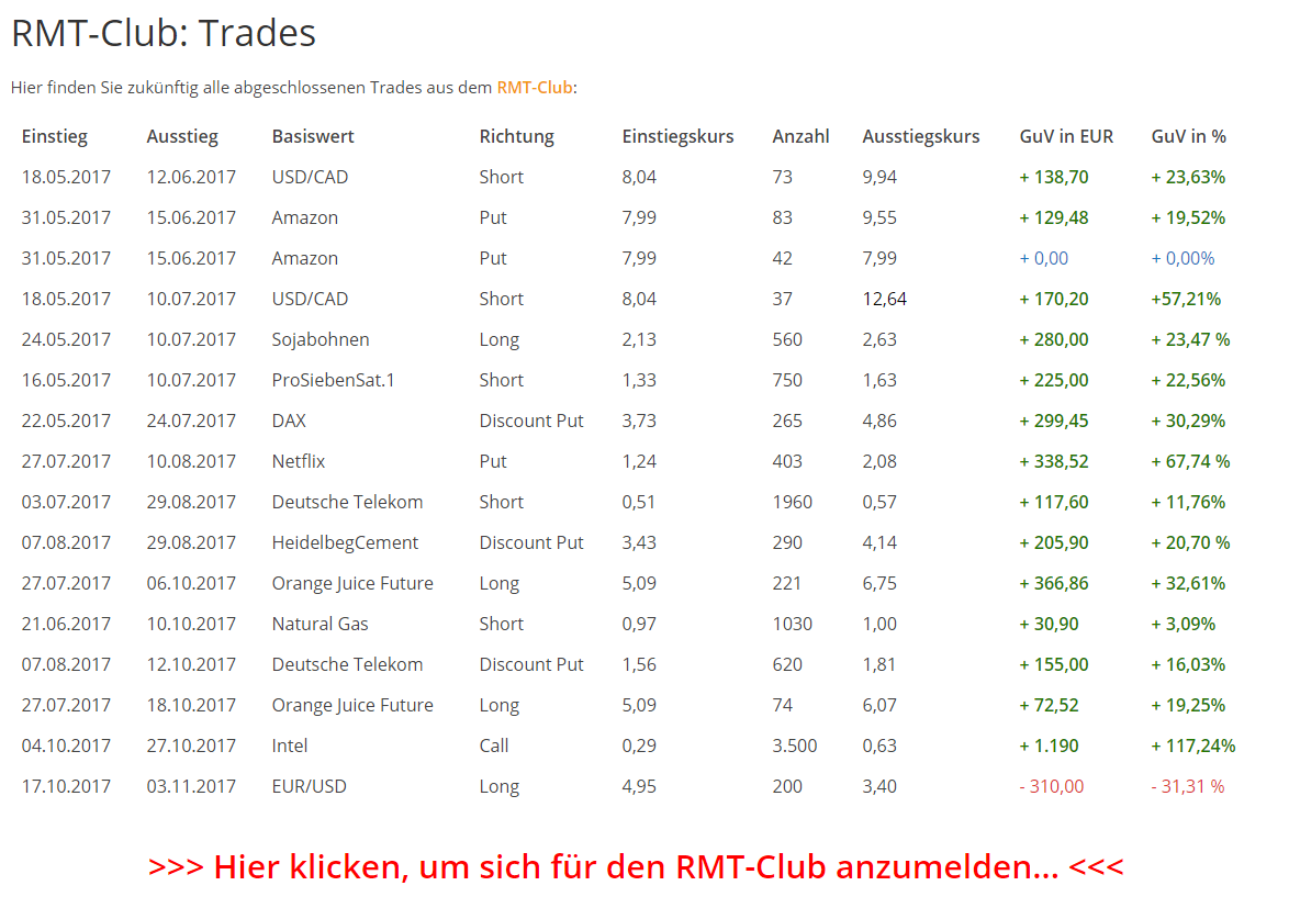 Alle bisher abgeschlossenen Trades im RMT-Club: