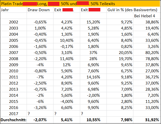 Ich selbst handele dieses Setup in Platin bereits seit 2002 aktiv und habe es bis ins Jahr 1976 zurücktesten können. Es war in 100% der Fälle profitabel. Dabei steigt man kurz vor Weihnachten in den Platin-Future Long ein und geht in zwei oder drei Tranchen binnen der ersten vier Monate des Folgejahres raus. Die genauen Ein- und Ausstiegstermine sind Inhalt unserer Ausbildung und werden daher an dieser Stelle nicht detailliert formuliert.