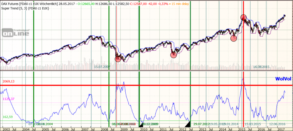 Intermarkets (Forecast), wie auch der Marktzustandsfilter WolVol indizieren für den DAX nur noch überschaubares Potenzial zur Oberseite für die nächsten Wochen und Monate. Wir nehmen daher einen Discount Put mit erster Tranche auf, bei dem wir noch etwas Spielraum gen Norden hätten und von einer zu erwartenden Seitwärtsbewegung profitieren können.