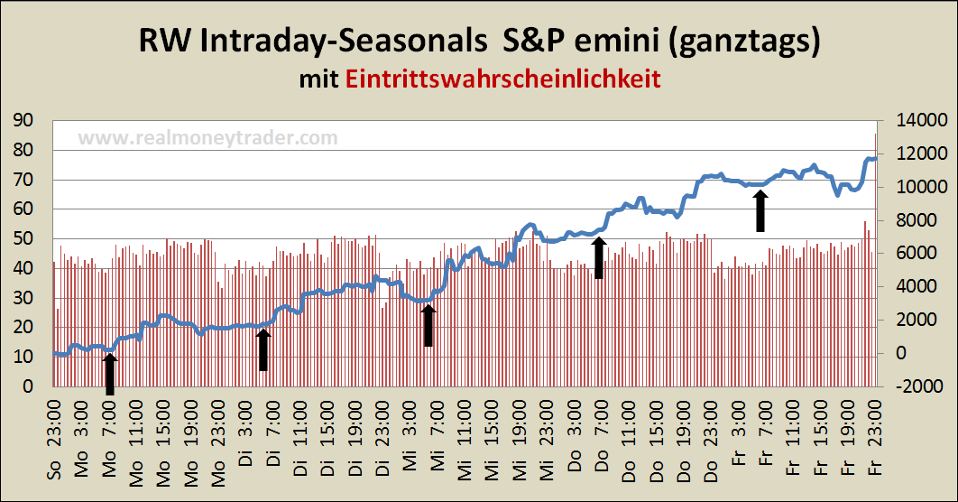 Eine essentielle Erkenntnis für einen Trader ist, zu wissen, dass nicht jeder Zeitpunkt gleich gut ist für einen Trade. Ein entscheidender Schritt hin zu mehr Profitabilität und Stabilität innerhalb des eigenen Trading ist daher das Separieren der „guten“ von den „schlechten Zeiten“. Es gibt meist fundamentale Gründe für komprimiert auftretende Zeiten, in denen sich ein Markt bewegt. Jedoch sind nur wenige Märkte sehr konstant in den Zeitfenstern. In vielen Märkten treten Intraday-Phänomene an ein, zwei oder auch mal drei Tagen auf. Doch kaum ein Markt weist für praktisch jeden Handelstag einer Woche das gleiche Zeitfenster für starke Bewegungen auf. Im S&P emini ist dies aber erfreulicherweise der Fall, wie wir bei unserer statistischen Analyse der unterwöchigen Bewegungen mit Hilfe unseres RW Seasonal Modells herausfanden.