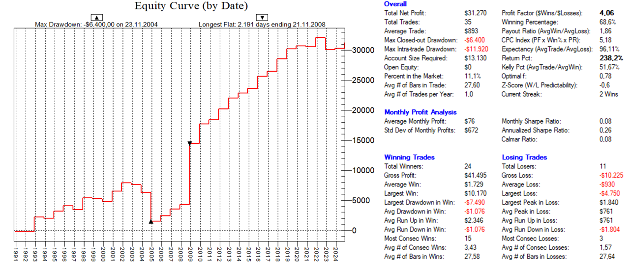 Die Performance-Kennziffern sprechen für sich: Eine angenehm hohe Trefferquote von knapp 61%, ein Profit Factor von sensationellen 2,73 (was ein sehr gesundes Gewinn/Verlust-Verhältnis ausdrückt) und ein durchschnittlicher Gewinn pro Trade von 833$ machen diese Strategie für praktisch jeden Trader attraktiv. Für die Umsetzung sind etwa 5-10 Minuten pro Monat einzukalkulieren. Und natürlich können alle Trades mit Futures (darauf basieren unsere Zahlen), CFD´s und Hebelzertifikaten umgesetzt werden. Durch den minimalen Draw Down von lediglich 20.000$ kann dieser Ansatz problemlos und ohne zusätzlichen Kapitalbedarf zu bereits bestehenden Strategien hinzu genommen werden. Sie verhalten sich komplementär zu diversen bisher geschulten Ansätzen. Im Schnitt läuft ein Trade 22 Handelstage, was etwa einem Monat entspricht.