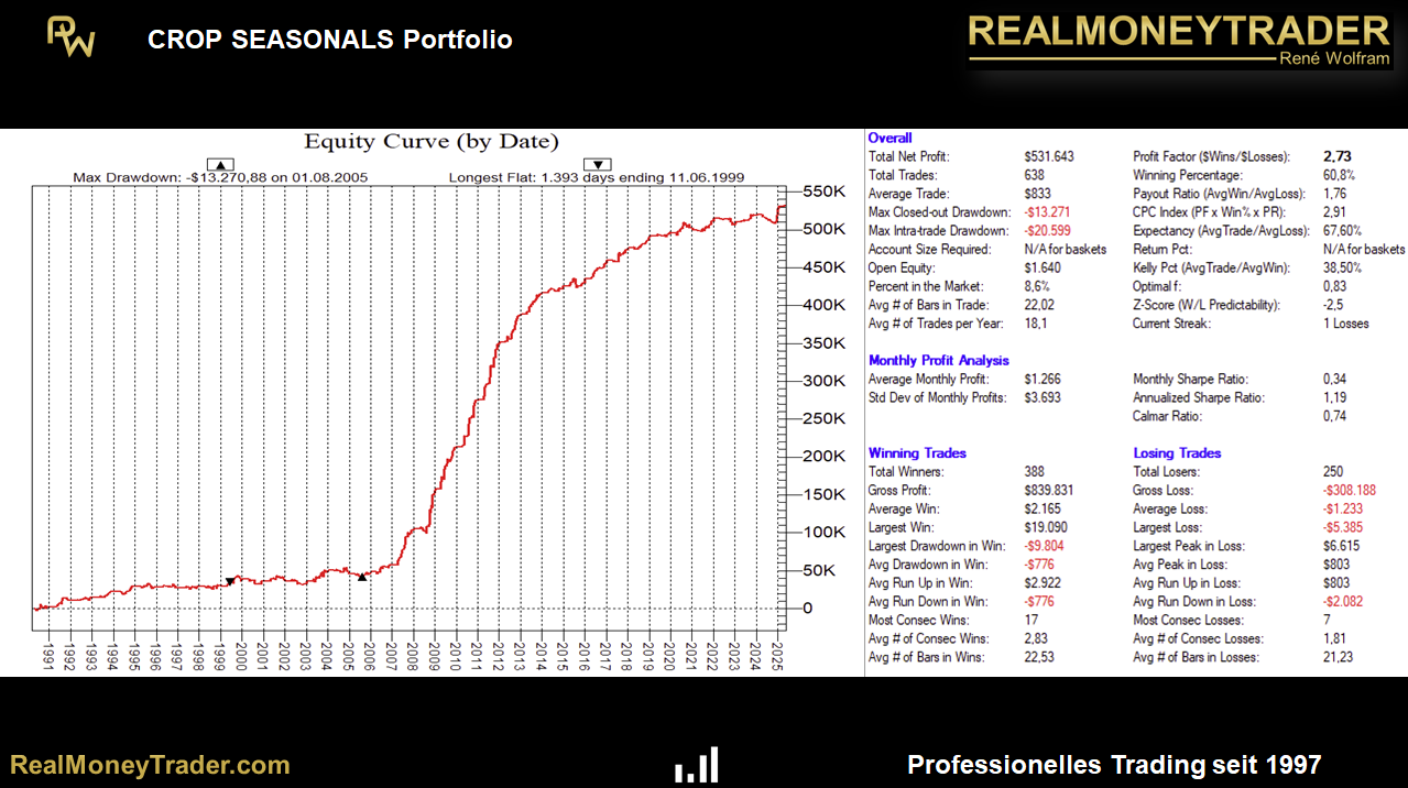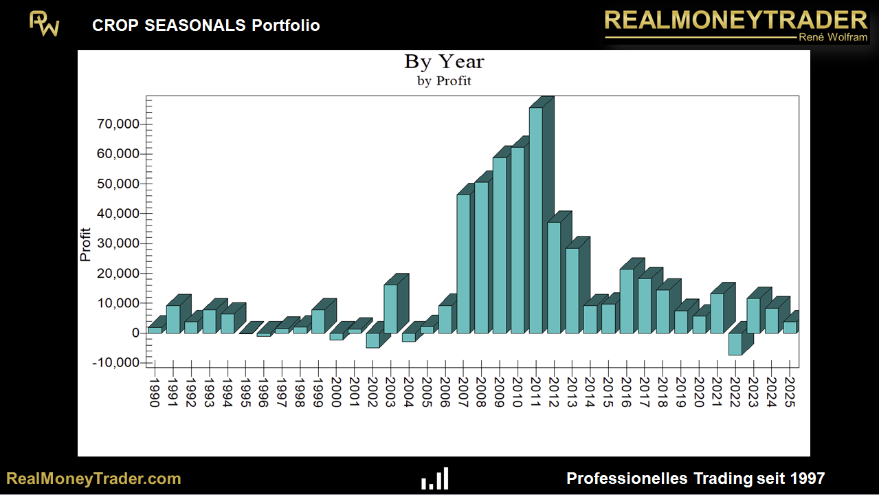 Zuletzt hatten wir mit den BIG SEASONAL TRENDS große, mehrwöchige und mehrmonatige zyklische Schwünge, die auf den Produktions- und Verbrauchszyklen verschiedener Rohstoffe basieren, geschult. Ergänzend dazu zeigen wir in unserem nächsten Online-Seminar mit den CROP SEASONALS überwiegend Währungs-Setups, die unmittelbar mit den Lieferperioden der Rohstoffe zusammenhängen. Hierzu erklären wir, welche Prozesse des Hedgings in den Währungen der Rohstoff-Länder unmittelbar vor und ab Beginn der Erntezeit stattfinden. Hierauf basierend haben wir ein Portfolio aus weiteren 19 saisonalen Setups, deren Regeln wir schulen im Online-Seminar, welches mit den PDF-Unterlagen und der Video-Aufzeichnung ergänzt werden. Diese 19 Setups wurden noch nie geschult und sie ergänzen die BIG SEASONAL TRENDS perfekt, da die CROP SEASONALS kürzer angelegt sind und sich schwerpunktmäßig auf Rohstoff-Währungen beziehen.