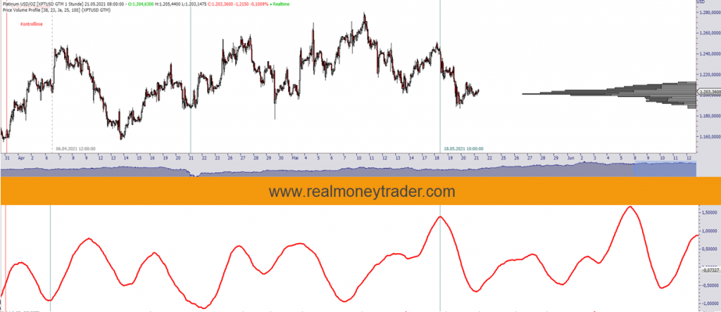 Der Forecast-Indikator (rot, unterhalb des Preis-Charts) zeichnet den auf Basis der Haupteinflussfaktoren wahrscheinlichsten Marktverlauf vor. Dabei geht es NICHT darum, die absolute Höhe und Dimension der einzelnen Schwünge vorzuzeichnen, sondern lediglich um die Dimensionierung von Richtung und Zeit. Ob das Hoch der nächsten Welle also höher liegt, als das vorherige, soll der Indikator NICHT anzeigen.