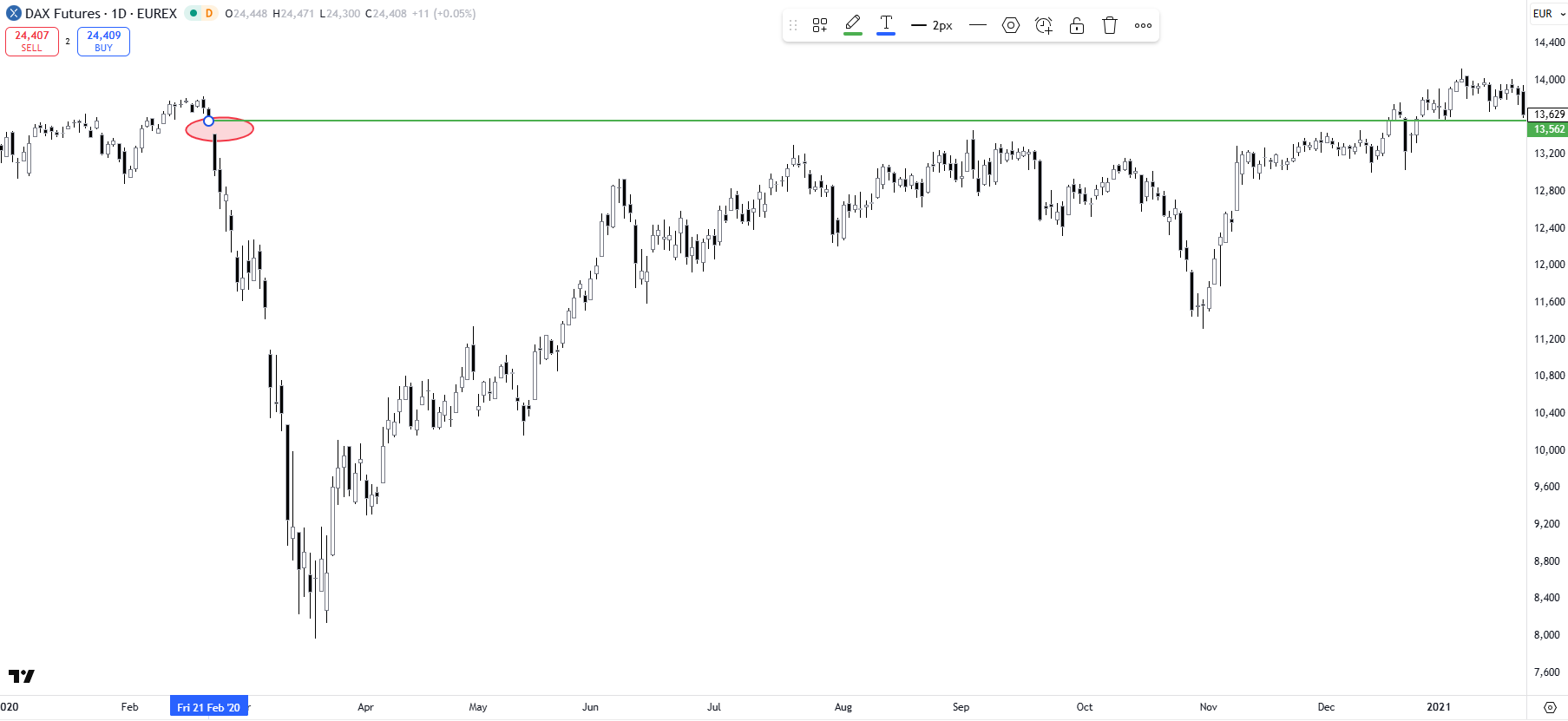 Am 24.02.2020 entstand im FDAX eine Abwärtslücke. Die Lücke wurde tatsächlich geschlossen: am 16.12.2020, also knapp 10 Monate später. Mal abgesehen davon, dass man hier 10 Monate sein Kapital gebunden hätte, wären für 2500 Euro Profit zwischenzeitlich -125.000 € Verlust hinzunehmen gewesen. Die allermeisten Konten hätten das nicht überlebt. Eine Statistik á la „über 80% der Gaps werden wieder geschlossen“ ist so sinnvoll, wie wenn Du mitten im Ozean vom Schiff fällst, und einer von einem vorbeifahrenden Schiff Dir zuruft „immer geradeaus schwimmen – irgendwann kommt Land!“.