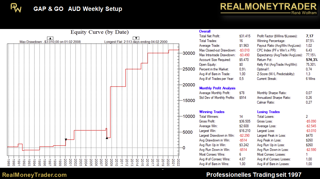 Auf Wochenbasis arbeitet ein GAP & GO Setup auf den Australischen Dollar (andere auch auf Tagesbasis, sprich 1 Kerze = 1 Tag). Wenn eine Kurslücke (übers Wochenende) in einem bestimmten Mindestmaß (x Prozent des 10-Perioden-Durchschnitts) auftritt, dann setzt in 87,5% der Fälle ein kurzfristiger Trend ein. Im Durchschnitt macht ein solcher Trade bei lediglich einer Woche Haltedauer 1963 Dollar Gewinn. Der Profit-Factor ist mit 7,17 sehr hoch und drückt die Rentabilität dieses Setups aus.