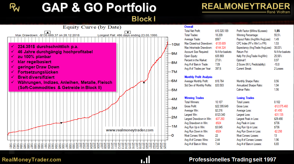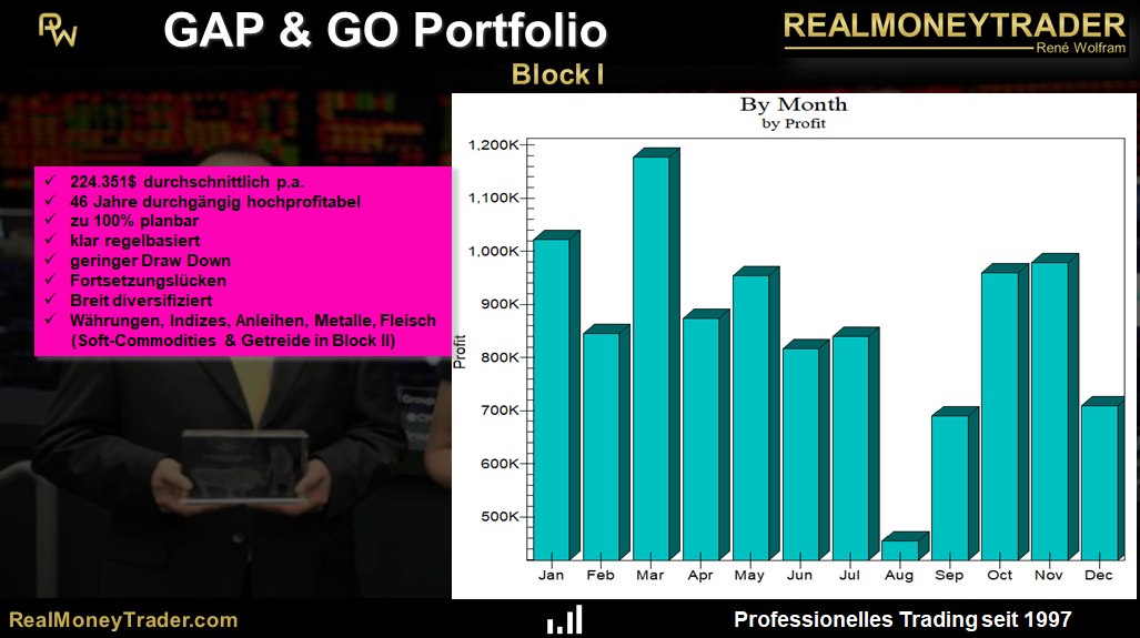 Breite Streuung bei den Strategien ist DER SCHLÜSSEL für eine stetige Performance, geringst-mögliche Schwankungen und gleichzeitig maximal mögliche Gewinne! Wir haben den gigantisch positiven Effekt u.a. in Videos auf dem RealMoneyTrader Youtube-Kanal, aber auch in unserem Seminaren immer wieder dargestellt und mit Zahlen belegt. Wir wissen, dass bei komplementären Strategien ein starker Diversity-Effekt eintritt und man für die Hinzunahme eines weiteren Ansatzes zu den bestehenden kaum oder gar kein zusätzliches Handelskapital benötigt. Man tradet also mit dem gleichen Kontovolumen wie vorher, hat aber geringere oder gleiche Schwankungen, erhöht dabei aber den Gewinn deutlich. Die GAP & GO Strategien haben keine Überschneidungen mit anderen Portfolios und kommen in keinem anderen unserer Ansätze (Portfolios) vor. Sie sind damit eine perfekte Ergänzung zu unseren Swingtrading-Strategien und zu den anderen Daytrading-Ansätzen, die wir nutzen und schulen.