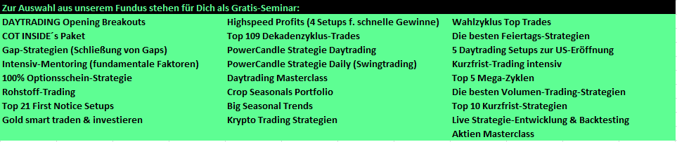 Im Rahmen unseres diesjährigen TRADING-HERBST haben wir viele Spezial-Angebote für unsere Kunden. So auch bei diesem Paket. Alle Teilnehmer dieses Thementag-Seminars können GRATIS an einem der künftigen Thementag-Seminare teilnehmen oder Unterlagen und Video eines beliebigen Thementag-Seminars aus unserem reichhaltigen Fundus kostenlos erhalten. Was genau Du möchtest erfragen wir dann noch von Dir.