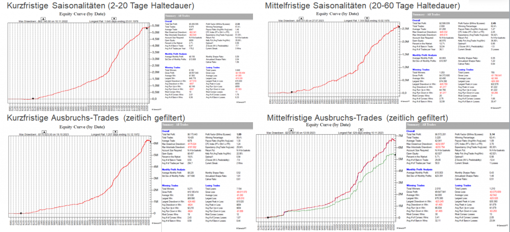 René bedient sich aus dem gesamten Fundus seiner Strategien, der über 500 Setups umfasst. Das beinhaltet unter anderem PowerBreakouts, saisonale Trades aus dem kurz- und mittelfristigen Bereich, News-Strategien, technische Setups, fundamentale Trades, sowie Spread-Trades. Exemplarisch die Kapitalkurven von großen Strategie-Blöcken, die von den anderen Ansätzen ergänzt werden.