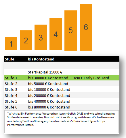 Bei uns gibt es keine automatische Verlängerung, ein Abo oder dergleichen. Wenn du Stufe I der HEXA Multi-Strategy buchst, dann bist du solange, bis das Konto von René bei 30.000 € steht (wie lange auch immer das dauert). Damit enden die Stufe und deine Teilnahme.
