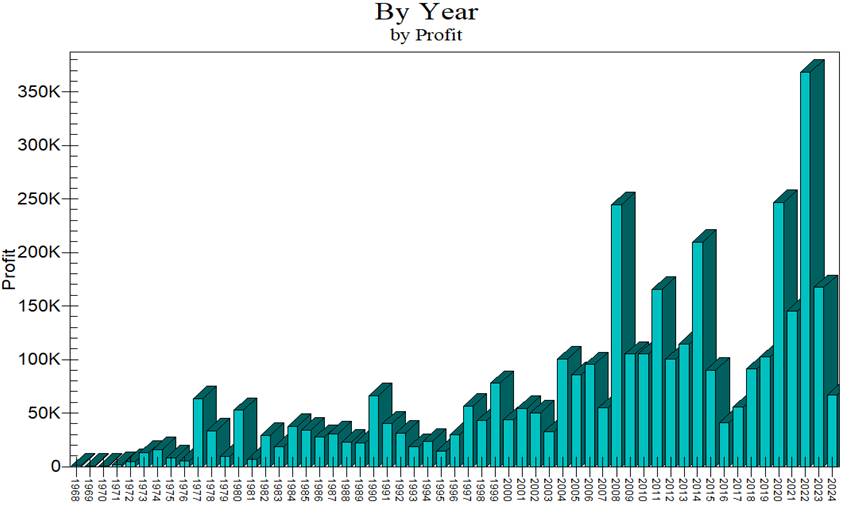 Wer bereits gängige Ausbruchs- und Trendstrategien gehandelt hat, weiß, dass diese eine hohe Fehler- und geringe Trefferquote von meist etwa 30% aufweisen. Zudem sind sie zwar einerseits lukrativ (weil mit Trends eben großes Geld zu verdienen ist), aber sie verursachen üblicherweise auch große Schwankungen. Ganz anders unser RW Miracles: hier haben wir in 55 Jahren Historie niemals mehr, als 28.306$ Draw Down gehabt. Selbst in der jüngsten Vergangenheit (2022/23), als selbst die Top-Strategien aus unserem Fundus größere Draw Downs hatten und diese sich ausgeweitet haben, bleib im RW Miracles alles, wie es schon immer war. Die Trefferquote liegt bei sagenhaften 67,6%!!! Und das bei einem Breakout-Ansatz! Mit nur 3% Investitionszeit ist dein Handelskapital die restlichen 97% der Zeit für andere Strategien frei. 2080$ durchschnittlicher Gewinn pro Trade zeigen absolute Robustheit und Effizienz des Ansatzes. Änderungen in den Börsengebühren oder dergleichen können der Strategie nichts anhaben.