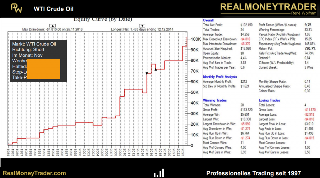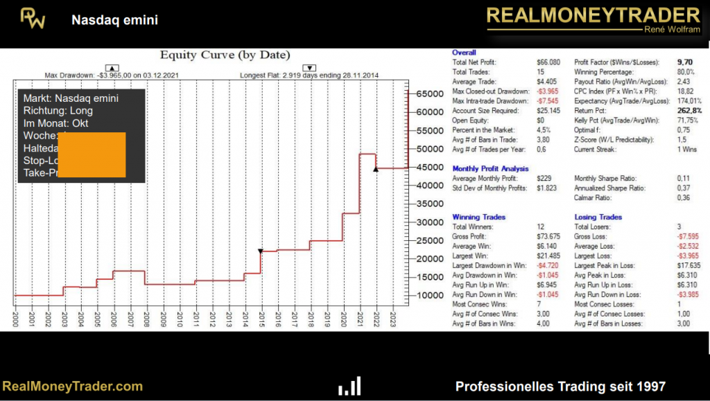 Die Zeit von September bis Ende Februar des Folgejahres hat den mit Abstand größten Anteil an der Performance. Wenn wir im Oktober starten geht es direkt mit jener Zeit los, in der die meisten Trades stattfinden und das meiste Geld verdient wurde. Ich rate aber auch hier wieder mit Nachdruck dazu, nicht in solchen kurzen Zeiträumen zu denken und schon gar nicht zu bewerten. Wir haben einen statistischen Vorteil. Und den spielen wir über das Gesetz der großen Zahlen durch massenhafte Wiederholungen aus. Ein gesunder Planungshorizont für dieses Portfolio sind 5 Jahre. Dann hast Du zwischen 160 und 200 Trades getätigt, und bist am Beginn des statistisch signifikanten Bereichs.