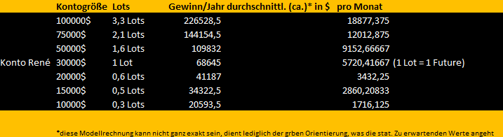 Bitte beachte, dass es sich hier um grobe Modellrechnungen handelt. Gewinne kann man nicht exakt vorausberechnen. Basierend auf der Statistik von 1 Kontrakt / sprich 1 Lot kann man abschätzen, bei welchem reduzierten oder erhöhten Einsatz welches Ergebnis durchschnittlich erzielt werden kann, wenn der Ansatz über einen angemessen langen Zeitraum konsequent angewendet wird.