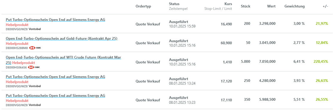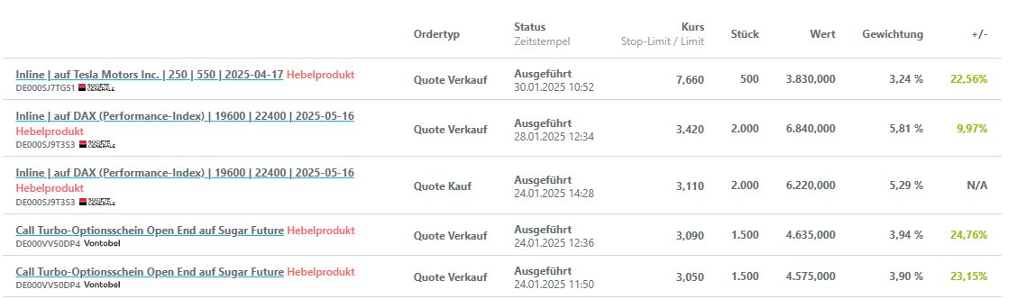 Was Du bei uns lernst, setzen wir auch selbst um! Das unterscheidet RealMoneyTrader-Ausbildungen von denen anderer Anbieter und vor allem auch von einschlägigen Lektüren. Hier Auszüge von Trades, die basierend auf der im Online-Seminar geschulten Vorgehensweisen, in jüngster Vergangenheit getätigt wurden.