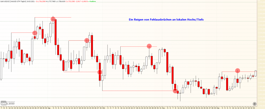 Falsch ist auch, das WANN des Ausbruchs nicht zeitlich zu limitieren. Denn WENN wir davon ausgehen, dass fundamentale Faktoren einen Preisschock auslösen, dann ist es eine logische und zwingend notwendige Konditionierung, dass der Ausbruch zeitnah erfolgt, und nicht nach x Monaten. Hier ein Chart-Ausschnitt von Gold, der zeigt, wie oft es an lokalen Hochs und Tiefs Fehlausbrüche geben kann. Es greift Konto und Psyche an, wenn man solch ein Auszahlungsprofil dauerhaft erlebt.