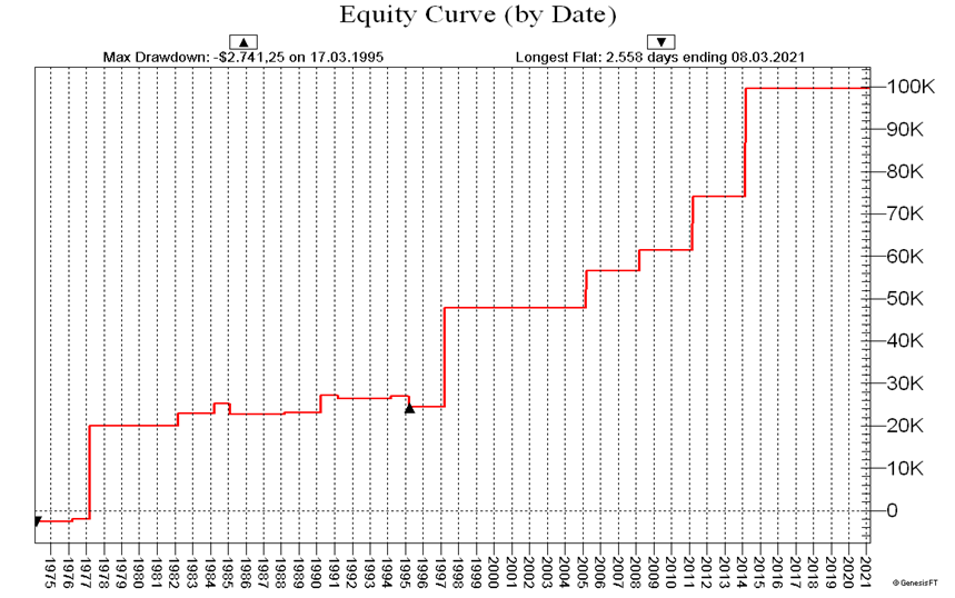 Wichtig: Es handelt sich um konditionierte Breakouts, sprich: die Strategie handelt nicht immer, sondern hat auch Situationen, bei denen es keinen Trade gibt, was sich in der Kapitalkurve mit den flachen, waagerechten Parts darstellt. Die tatsächliche Equity (aller Trades) schaut umso steiler aus, wenn man die Equity um die nicht ausgeführten Trades bereinigten würde. Nachfolgend die identische Equity, aber NUR die Trades aneinander gereiht, ohne die Jahre, in denen es keine Ausführung und damit keinen Trade gegeben hat:
