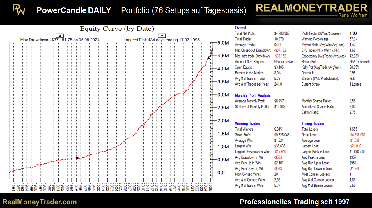 Die Historie der PowerCandle Strategie reicht zurück bis ins Jahr 1980. In dieser Zeit hat die Strategie im Multi-Märkte-Modus (also angewendet auf sämtliche Märkte) 4.789.966 Dollar Gewinn erzielt. Dabei blieben die Schwankungen sehr gering! Der Maximale Draw Down belief sich zu keiner Zeit auf mehr als 38.152 Dollar. Alle Zahlen beziehen sich auf standardmäßig und durchgängig einen gehandelten Futures-Kontrakt. Natürlich ist die Strategie auch mit skalierbaren Produkten, wie CFD´s, aber auch mit Hebelzertifikaten umsetzbar. Im Durchschnitt wird ein Trade 6 Tage gehalten.