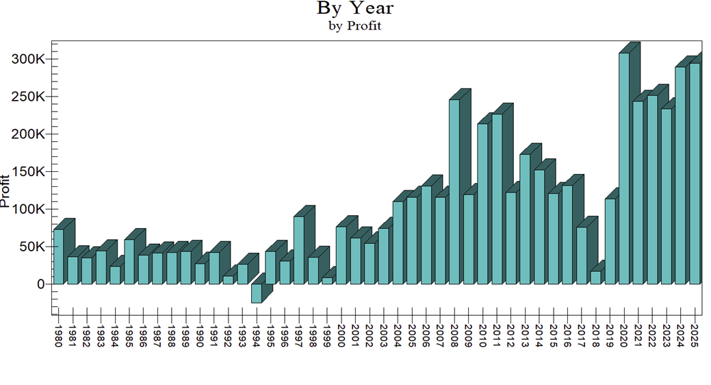 Jedes Jahr seit 1980, ausgenommen 1994, erzielte Gewinn mit dieser Strategie! Dabei waren Krisenjahre wie 2008 (Finanzkrise USA), 2010/11 (Rohstoffpreise explodierten), aber auch 2020/21 (Corona) und 2022 (Ukraine-Krieg) besonders gewinnträchtig. Im Durchschnitt erzielt die PowerCandle-Strategie 133.054 Dollar Gewinn pro Jahr. Während viele Strategien, die Du aus Büchern kennst, einst funktionierten, sich aber im Verlauf der Zeit abschwächen und irgendwann gar nicht mehr funktionieren, ist auch diese Strategie nicht nur konstant profitabel durch sämtliche Marktphasen, sondern wird im Verlauf der Zeit immer lukrativer.
