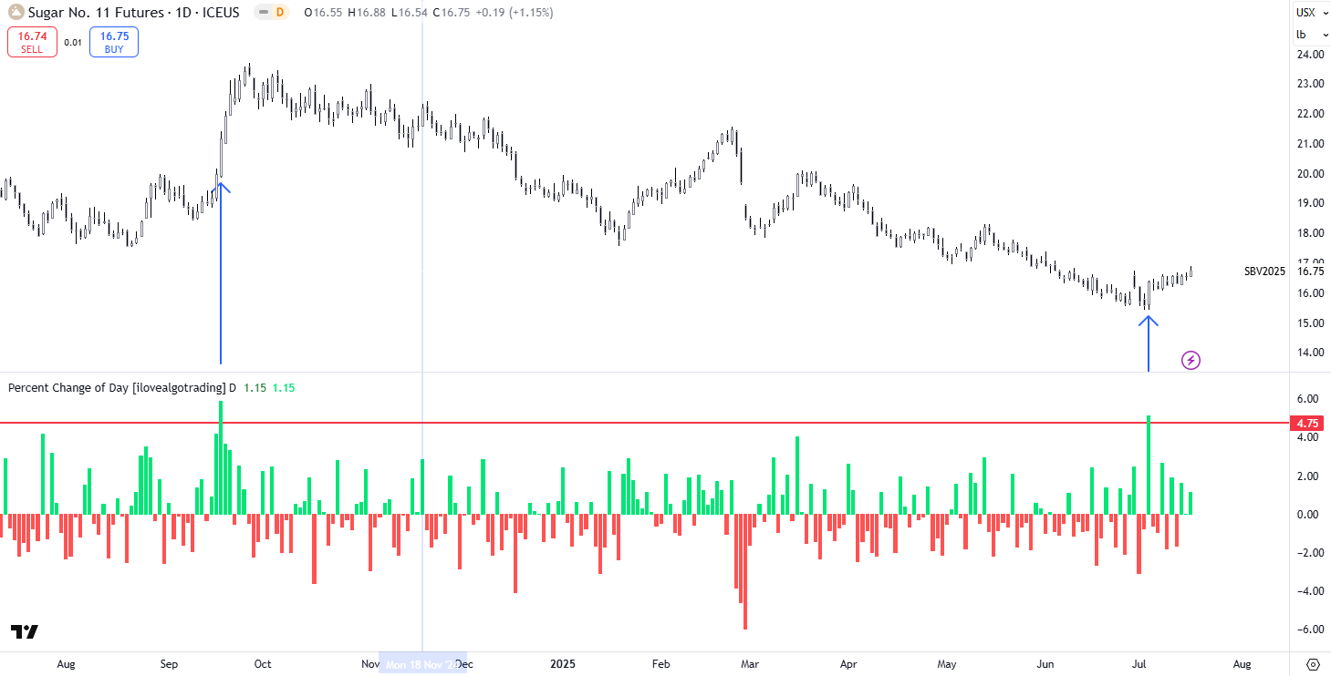 Am Beispiel des Zucker-Futures kann man ausgezeichnet sehen, wie unser Konzept der PowerCandles die kurzfristigen Trends, die von den großen Marktteilnehmern geprägt werden, identifiziert und ausnutzt. In beiden (siehe blaue Pfeile) Fällen startete ein kurzfristiger Aufwärtsschub mit einer außergewöhnlich großen, trendigen Tageskerze. PowerCandles nutzen wir in jedem Markt sowohl für die Long-, wie auch für die Shortseite. Allerdings sind die Schwellenwerte individuell unterschiedlich. Bedeutet: Die Anforderung, wie groß eine PowerCandle im spezifischen Markt sein muss, ist von Markt zu Markt und zwischen Long und Short unterschiedlich. Übrigens sehen wir im Chart auch (obgleich unser Beispiel sich auf zwei Long-Signale bezieht), dass Ende Februar eine Abwärtsbewegung ebenfalls mit einer PowerCandle startete.