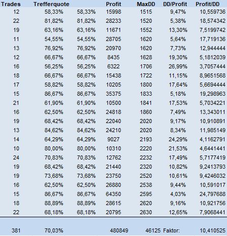 Insgesamt haben die hier geschulten Strategien zusammen einen Gewinn von 480.849 $ erzielt bei gerade einmal 7518 $ maximalen Draw Down. Mit der Zusammenstellung dieser Auswahl von PowerBreakout-Trades ist es möglich, mit relativ wenig Kapital (10-15.000 € Startkapital) fast ohne Zeitaufwand und bei geringer mentaler Belastung sein Kapital zu vermehren. Der durchschnittliche Gewinn je Trade liegt bei 1262 Dollar für dieses 23 Setups umfassende Portfolio, die alljährlich mit ganz präzise vorgegebenen Regeln für Einstieg, Stopp und Ausstieg umgesetzt werden können. Die nachfolgende Übersicht illustriert die wichtigsten Kennziffern jedes einzelnen der 23 Setups, wie Trefferquote, nominaler Gewinn (Profit) in Dollar, maximaler Draw Down (MaxDD) etc.