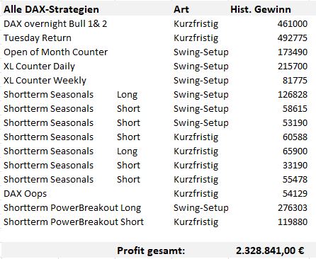 Der DAX ist nicht ohne Grund der mit Abstand beliebteste Markt der deutschen Trader: er ist volatil und kann mit Futures, CFD´s und Hebelprodukten gehandelt werden. Mit dieser Intensiv-Schulung bieten erstmals ein Online-Seminar aus unserer „Thementag-Reihe“ an, in dem ausnahmslos DAX-Strategien für den kurzfristigen und Swing-Handel geschult werden. Insgesamt werden 16 Strategien in dem etwa vierstündigen Seminar vorgestellt, die sehr zeitschonend umsetzbar sind. In der Historie (3 bis 5 Dekaden, je nach Setup) erwirtschafteten diese Setups zusammen 2,3 Millionen Euro Gewinn nach Abzug der Transaktionskosten. Nachfolgend sehen Sie eine Auflistung der Strategien und der jeweiligen historischen Performance.