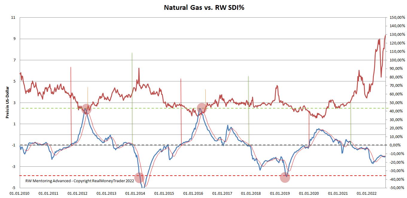 Nachfolgend siehst Du die grafische Darstellung des RW SDI, den Du im Rahmen des Thementag-Seminars geschult und ausgehändigt (auf Lebenszeit nutzbar) bekommst. Die rote Linie stellt den Preisverlauf von Erdgas (Natural Gas) dar, blau ist unser Indikator. Signale entstehen, wenn der Indikator die Null-Linie kreuzt. Ein Kreuzen von unten nach oben zeigt eine bevorstehende Abwärtsbewegung im Erdgas-Preis an, ein Kreuzen von oben nach unten indiziert eine zu erwartende Erdgas-Rallye.