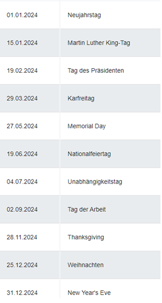 Wir schulen Strategien auf die nachfolgend aufgeführten US-Börsenfeiertage: