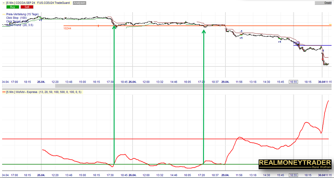 Ein weiteres Highlight dieses Seminars ist die Schulung des WolVol-Indikators und dessen praktische Anwendung, die René live in seiner Handelsplattform zeigt. Den Indikator hat er vor 13 Jahren entwickelt, um explosive Marktsituationen identifizieren zu können und zu wissen, wann Ausbrüche sich lohnen, aber auch, wann ein Trend vor der Erschöpfung steht, und es an der Zeit ist, Trades zu schließen. René zeigt seine WolVol-Strategie auf Kakao im 15-Minuten-Chart (ist genauso auch auf allen anderen Zeitebenen anwendbar) mit praktischen Signalen aus deinem Handelsalltag. In der laufenden Woche gab der WolVol bei 10.300 grünes Licht für einen Breakout-Trade. Kurz darauf wurde ein Preissignal Short ausgelöst. Binnen etwas mehr, als einem Tag brach der Kakaopreis um knapp 25% ein! Wir besprechen den fundamentalen Grund (wo Sie diesen rechtzeitig nachlesen konnten) und wie das WolVol-Signal Schritt für Schritt umgesetzt werden konnte.
