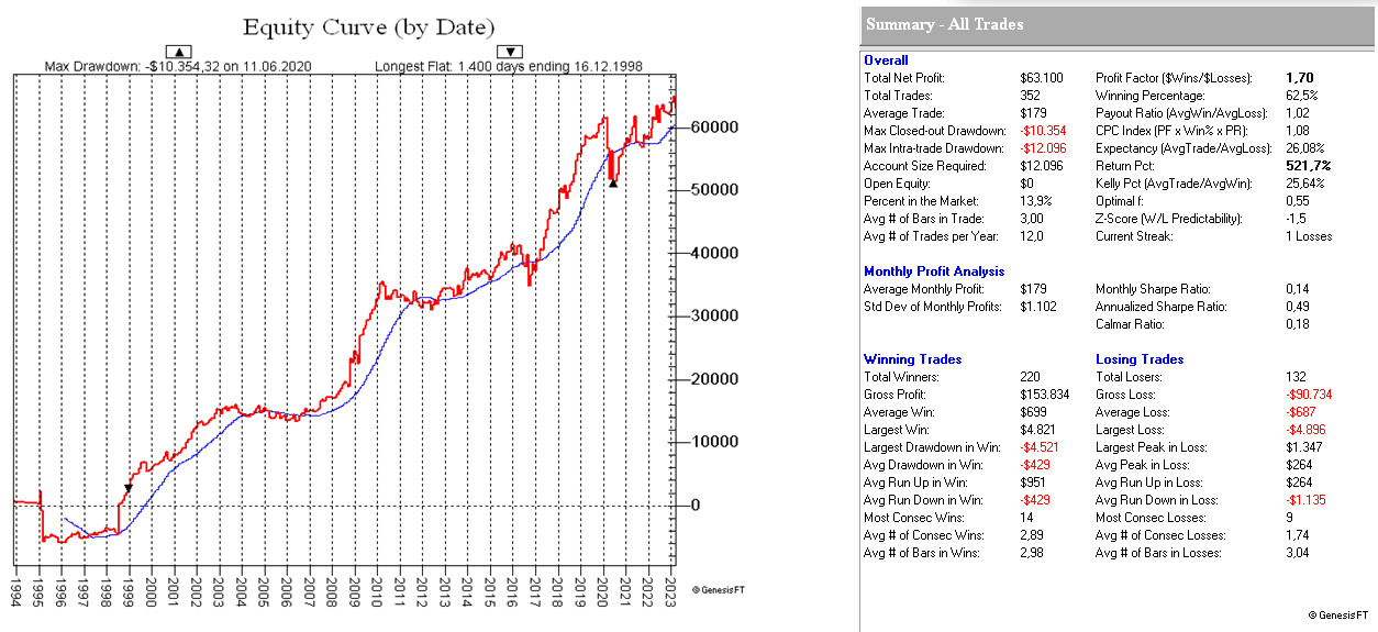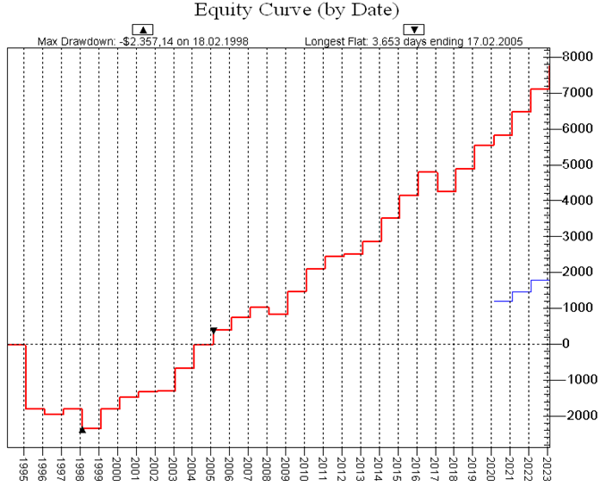 Die folgende Equity stammt von einer Strategie auf das Britische Pfund und ist seit 44 Jahren stetig positiv. Die Strategie handelt immer am gleichen Handelstag des Monats in eine spezifische Richtung und bleibt für einen klar terminierten Zeitraum von weniger als 2 Wochen im Markt.
